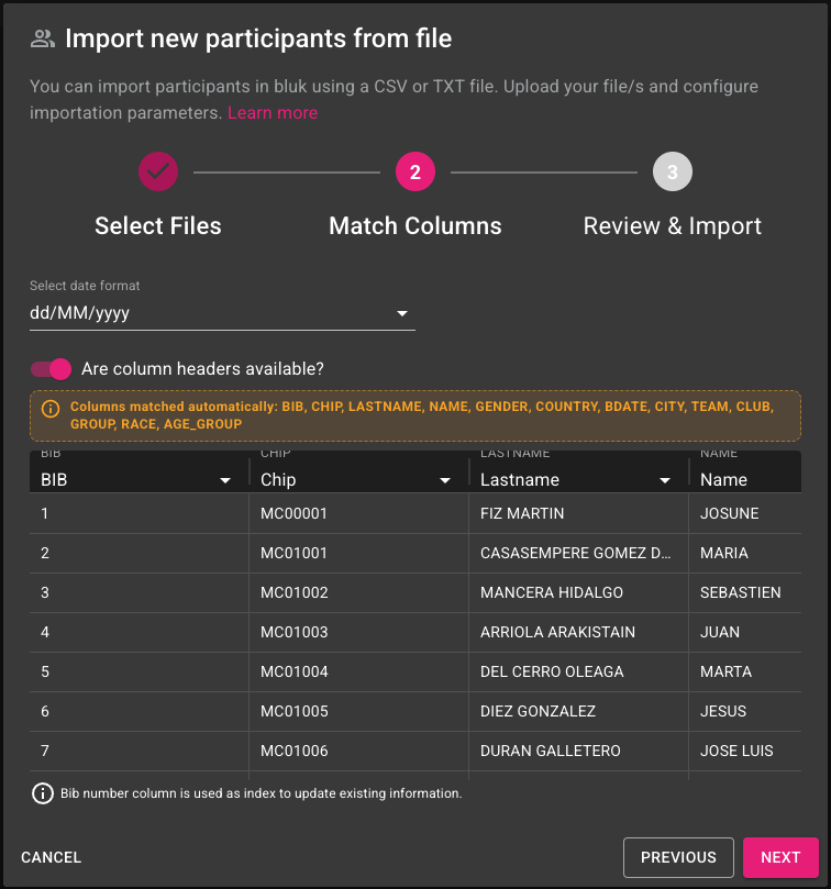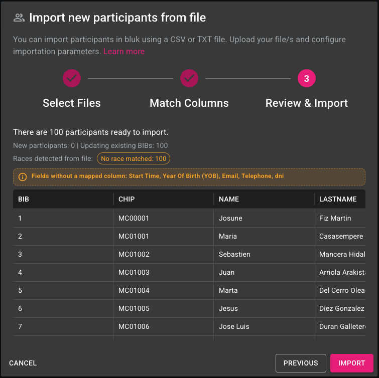 This detection is based on the **Bib number**, which is used as the primary identifier when importing.