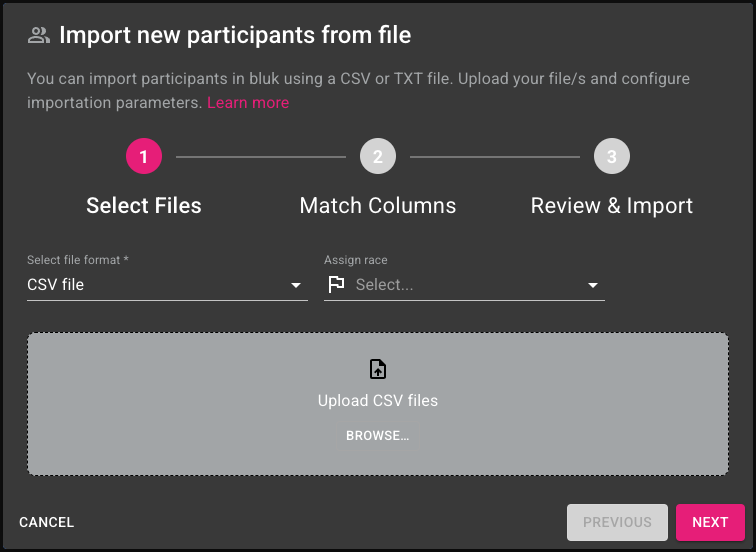 <figure><img src="https://3584810045-files.gitbook.io/~/files/v0/b/gitbook-x-prod.appspot.com/o/spaces%2FrWGIMpODLJh7hQ9aW4jB%2Fuploads%2FhwNDccD8ZKIgr9FMxIIL%2FScreenshot%202026-03-05%20at%2011.14.11.png?alt=media&#x26;token=85c38d78-3bf9-4cae-9e3d-6d92225df75c" alt=""><figcaption><p>Import Participants Step 1</p></figcaption></figure>
